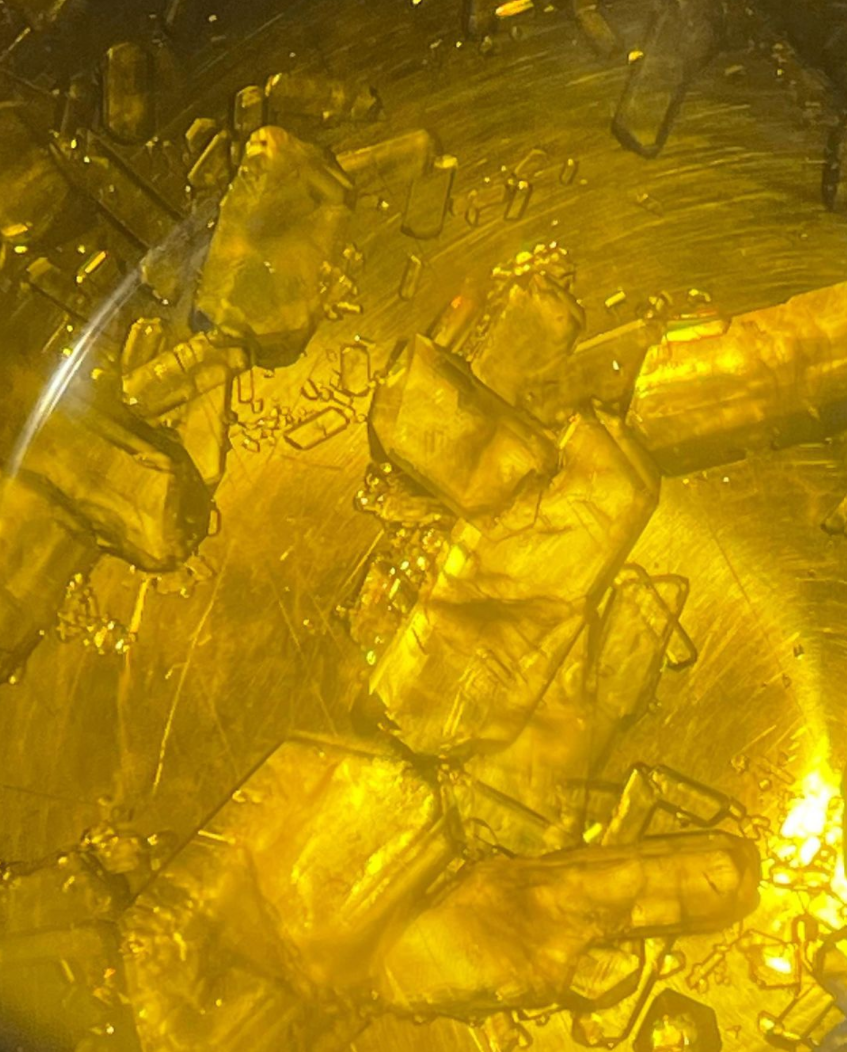 8. Ensure the vessel is completely sealed and store it for 1-2 weeks at 27-30C/80-86F, If crystallization doesn't occur off-gas the vessel to supersaturate the solution further and wait until crystals spontaneously nucleate.